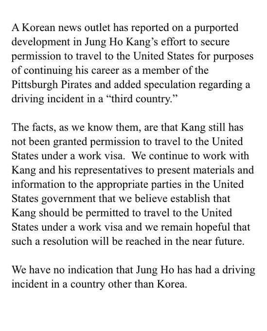Frank Coonelly statement on Jung Ho Kang work visa